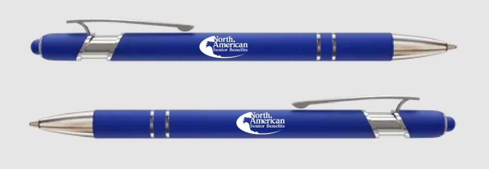 Soft Touch Pen with Stylus. North American Senior Benefits logo printed in White font. Pen is black ink.